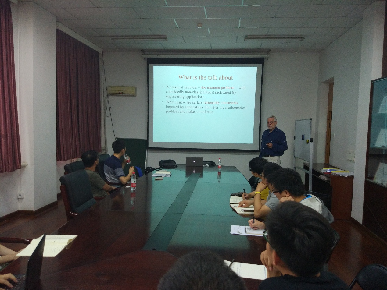2016年7月19日,应自动化学院陈杰教授邀请,上海交通大学电子信息与电气工程学院自动化系讲席教授,瑞典皇家工程院院士,国际著名的控制理论专家Anders Lindquist教授对“复杂系统智能控制与决策”国家重点实验室进行交流访问,并作了题为“On Moment Problems in Robust Control, Spectral Estimation, Image Processing and System Identification”的精彩学术报告,自动化学院多名师生参与并听取了报告。