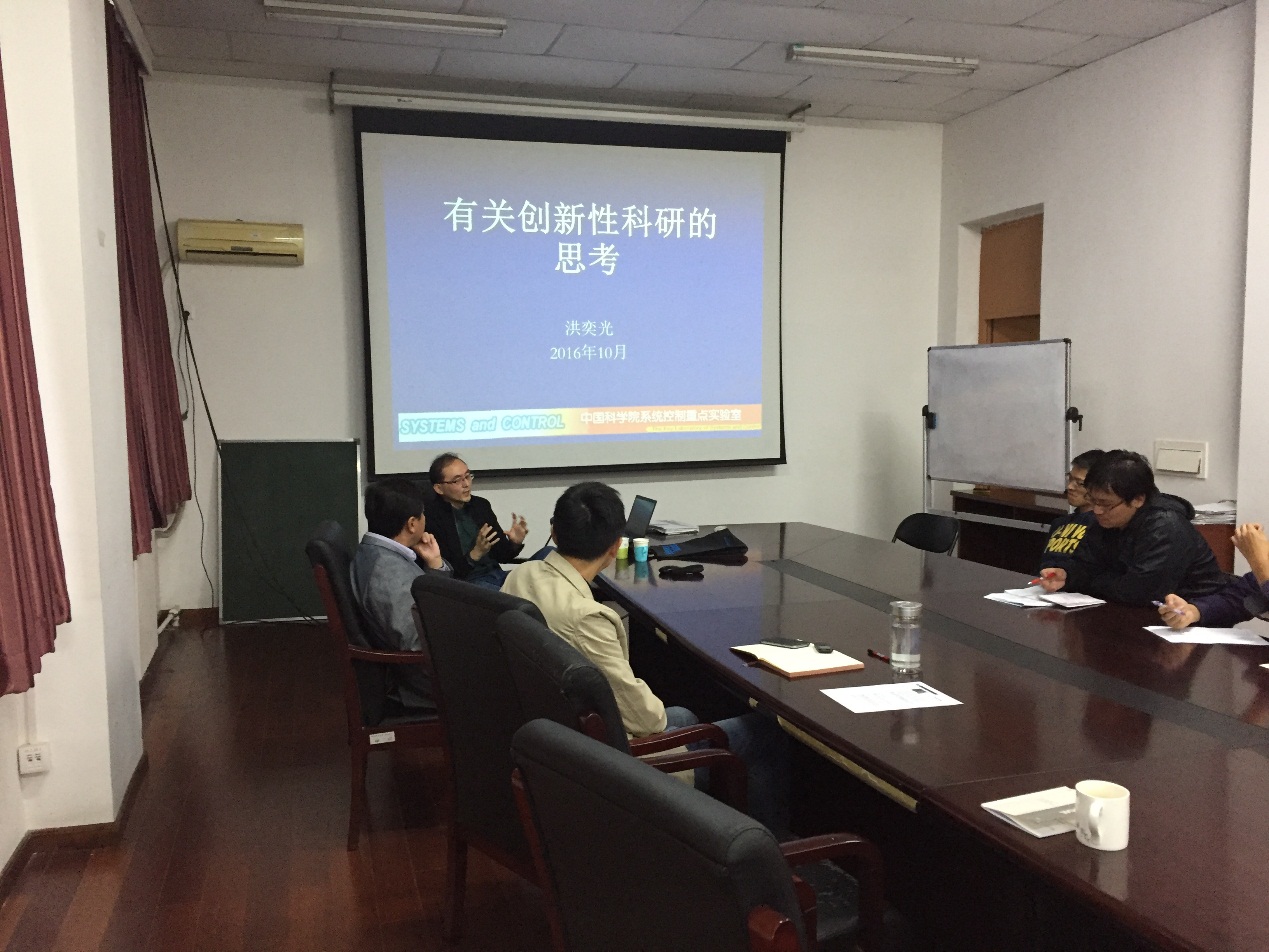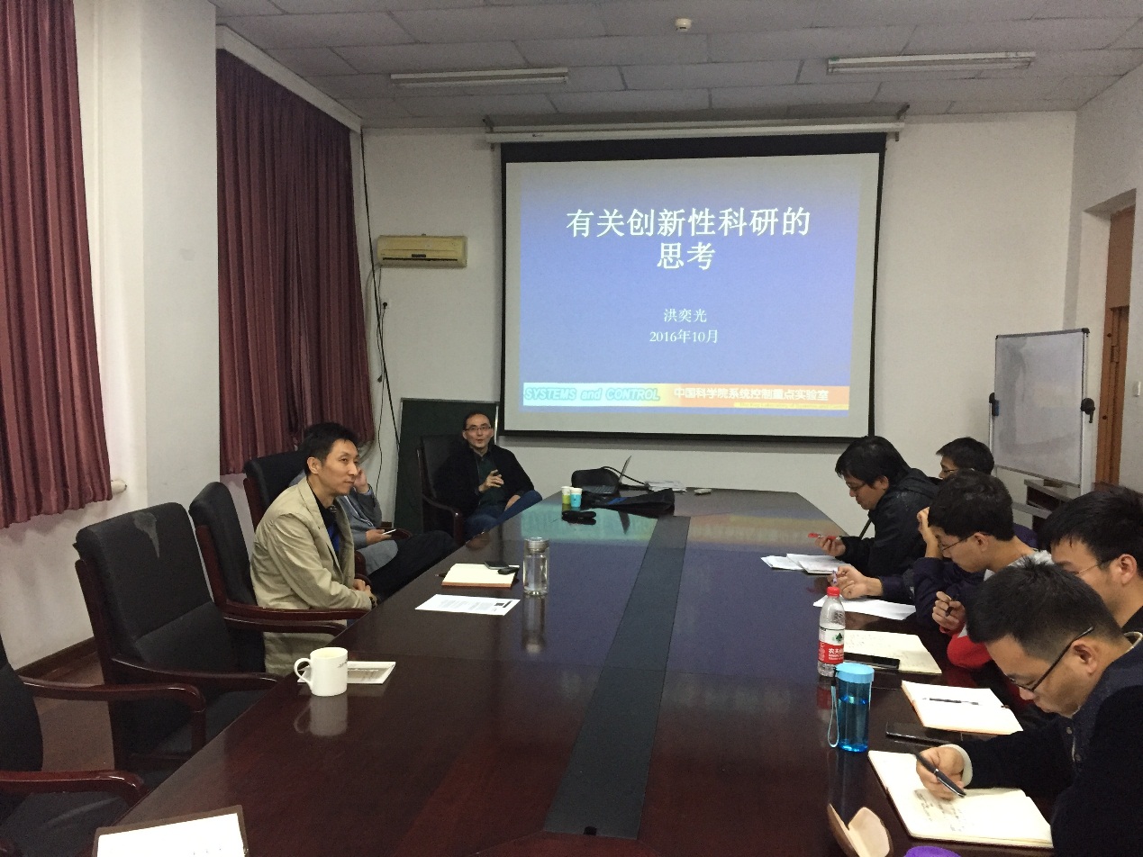 2016年10月17日下午,应重点实验室方浩教授的邀请,中科院数学与系统科学研究院洪奕光研究员对“复杂系统智能控制与决策”重点实验室进行交流访问,并做了题为“有关创新性科研的思考”的报告。实验室众多师生参与了此次讲座。