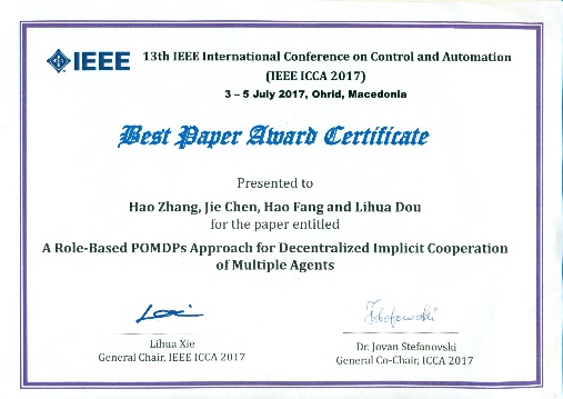 2017年7月3日至6日,在马其顿共和国举办的The 13th IEEE International Conference on Control and Automation (IEEE ICCA 2017)国际学术会议中,北京理工大学重点实验室张浩、陈杰、方浩等的论文“A Role-based POMDPs Approach for Decentralized Implicit Cooperation of Multiple Agents”获得大会的Best Paper奖。
